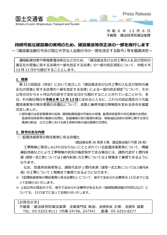 2024年12月13日から、監理技術者と営業所技術者に対する「専任義務」が一部緩和されます。
